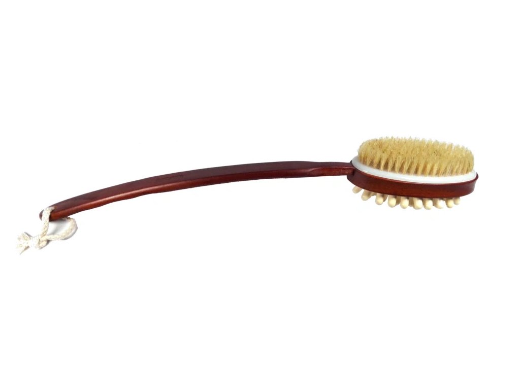 Masážní kartáč oboustranný přírodní štětiny a dřevěné výstupky odstraňuje odumřelé buňky, nečistoty, mastnotu a zároveň bojuje proti celulitidě.